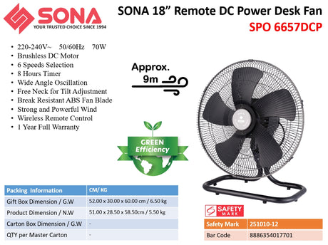Sona SPO 6655DCP | 6657DCP | 6659DCP Remote DC Power Desk Fan 16, 18,20 Inch - 3 Sizes Available App