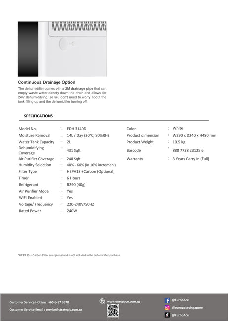 Europace EDH 3140D | EDH3140D Smart 3-in-1 Dehumidifier 14L