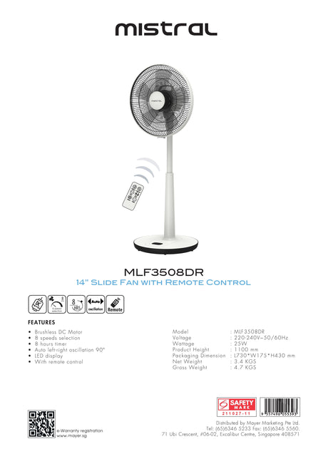 Mistral MLF3508DR DC Motor Slide Fan W/Remote 14 Inch