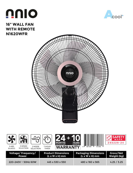 NNIO N1620WFR Remote Wall Fan 16 Inch