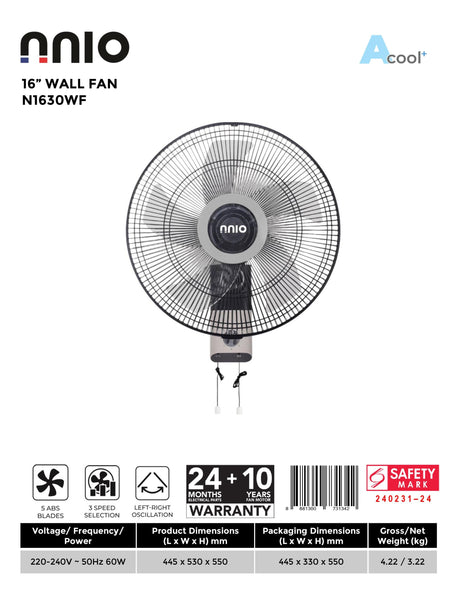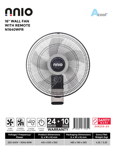 NNIO N1640WFR Remote Wall Fan 16 Inch