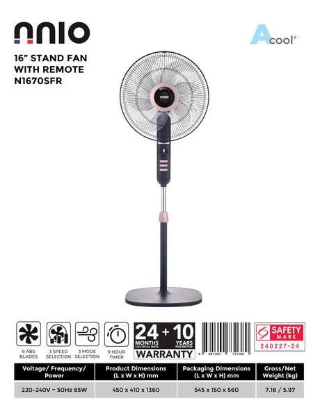 NNIO N1670SFR Remote Stand Fan 16 Inch