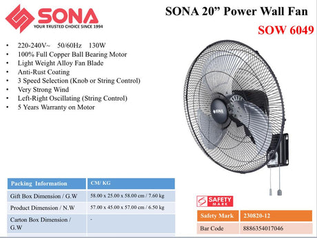 Sona SOW 6049 Power Wall Fan 20 Inch