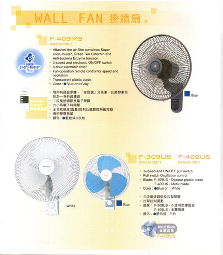 Panasonic F409US Wall Fan With Metal Blade & Pulling Cord 16 Inch