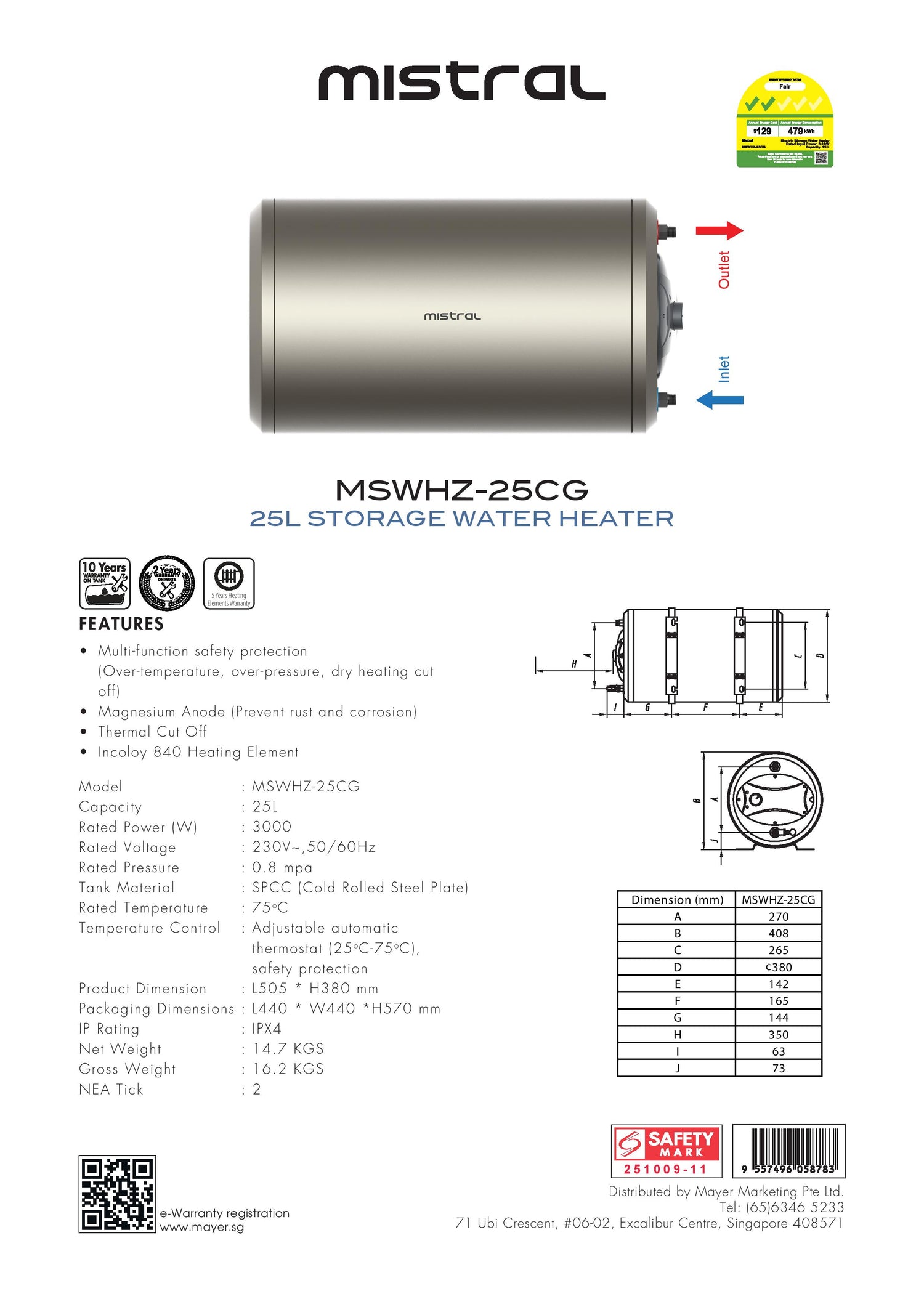 Mistral MSWHZ-25CG Storage Water Heater 25L
