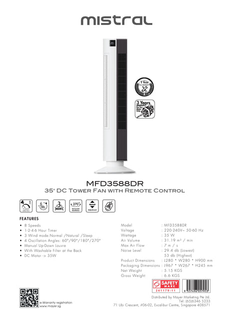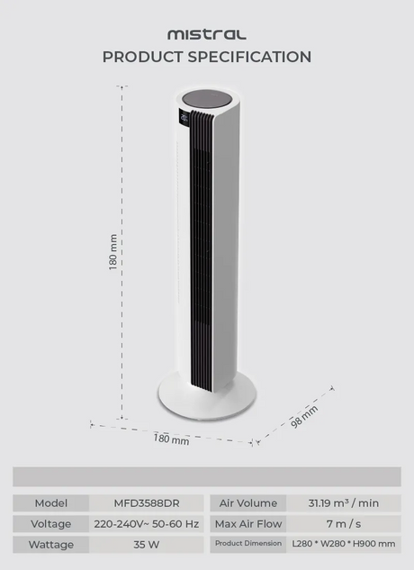 Mistral MFD3588DR DC Tower Fan with Remote Control 35 Inch