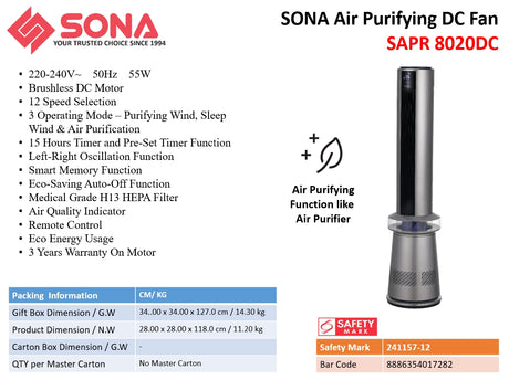 Sona SAPR 8020DC | SAPR8020DC Air Purifying DC Fan